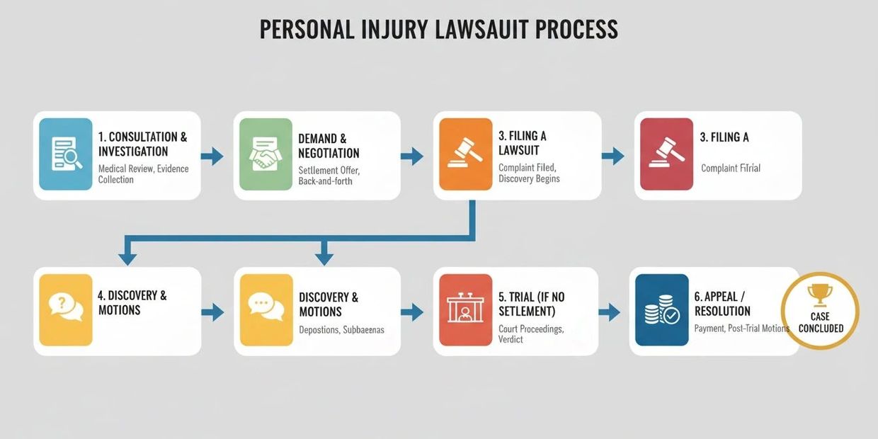A personal injury lawsuit typically involves the following steps: consulting with an attorney, investigating the incident, pre-suit negotiations, filing the lawsuit, discovery (gathering evidence), potential mediation, trial, and potentially appealing the outcome if dissatisfied with the verdict; with most cases settling before reaching a full trial through negotiations with the defendant's insurance company.